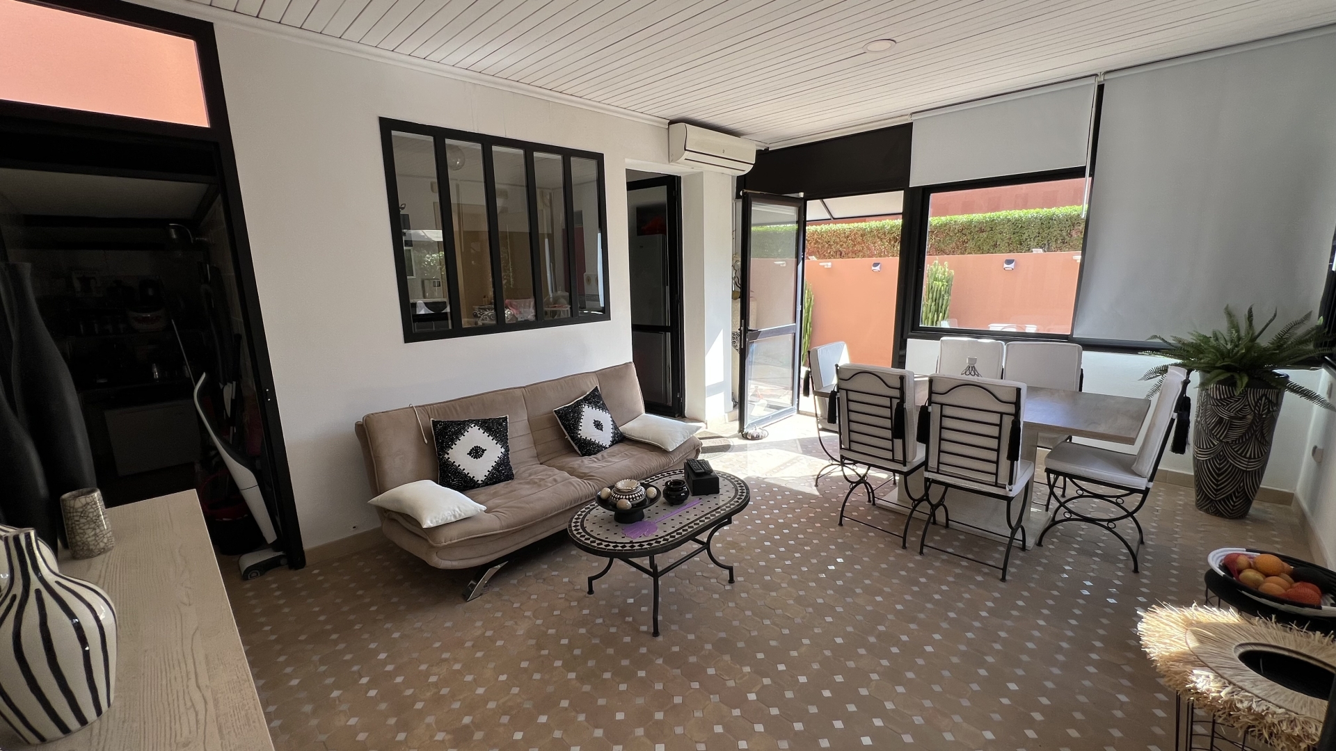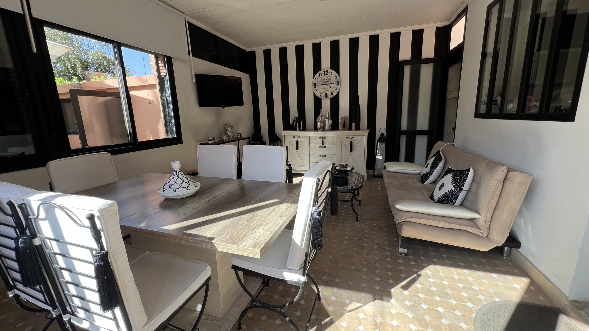 • Une terrasse couverte servant de coin repas climatisé avec débarras donnant sur terrasse