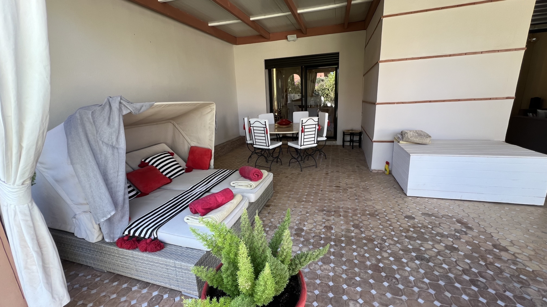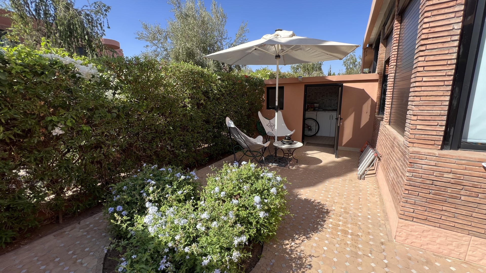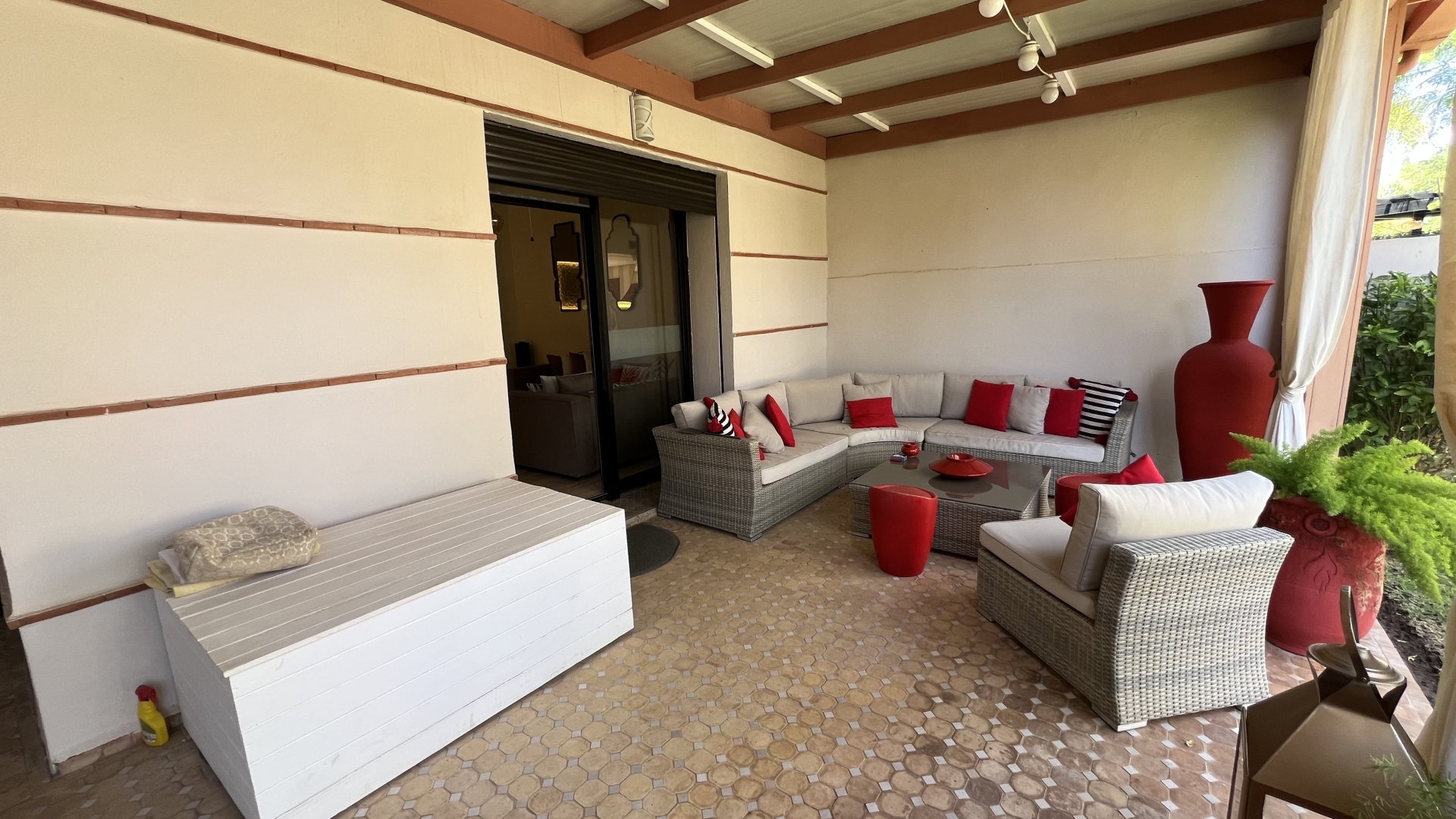 • Une terrasse couverte servant de coin repas climatisé avec débarras donnant sur terrasse